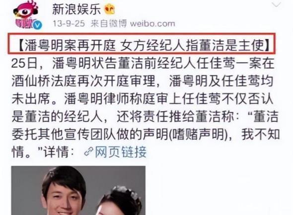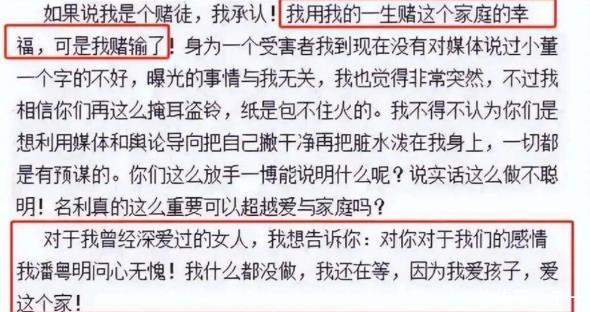 2012年10月,董洁工作室突然发出一份千字长文,不光正式宣布了离婚,还直言不讳地指责潘粤明“嗜赌成瘾、家暴行为频发、对家庭毫不负责”。